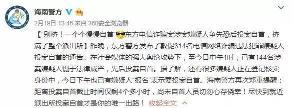 如此集中投案自首,源自此前一天海南省东方市公安局发出的一份通告。2月18日晚上9点,警方发布通告,督促314名电信网络诈骗犯罪嫌疑人投案自首:在逃人员务必在2019年2月19日下午六点前向公安机关自首,如实供述自己的犯罪事实,且积极退赃退款的,公安机关将给予从轻处罚或依法变更强制措施为取保候审。