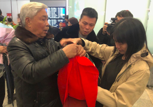 王茂富祖孙三人在机场等了近一个小时,终于接到了台湾的亲人