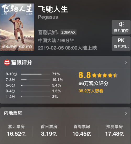 于2月5日大年初一上映的电影《飞驰人生》正在热映,该部电影是上海亭东影业有限公司出品的喜剧片,由韩寒执导兼编剧,沈腾、黄景瑜、尹正等主演。截止至2月22日,票房已成功破16亿。