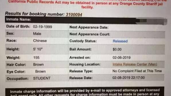 黄先生向现代快报记者提供了一份尔湾市警方的释放记录,显示:2月6日,警方将李某某拘押;2月8日,将其释放。