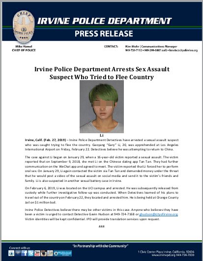 Kim Mohr介绍,今年1月29日,一个16岁的受害者在家人陪伴下到警局报警。女生称,在2018年9月遭到李某某性侵,并被威胁、勒索。2月6日,尔湾警局在加州大学尔湾分校将李某某逮捕,但因证据不足,李被释放。2月22日晚,警方在获悉李某某企图潜逃回国的动机之后,在洛杉矶国际机场将其抓获。