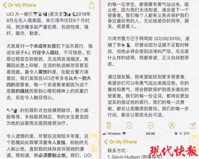 现代快报讯 出国求学,满怀憧憬,无限的美好正在眼前展开。可是,对于一些初次离开父母的“雏鹰”来说,却有可能遇到想不到但突然来袭的伤害。黄先生是一名美籍华人,住在美国加州尔湾市,作为一名愤怒的举报者,他最近连续在网络发文谴责一名中国留学生李某某,称其不仅暴力性侵了自己的表妹,还调查发现有多名女生受到其侵害。