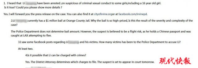 当天,尔湾市警局发言人Kim Mohr在回复现代快报的邮件中表示,尔湾警局很重视UCI中国留学生李某某涉嫌多起性侵一案。