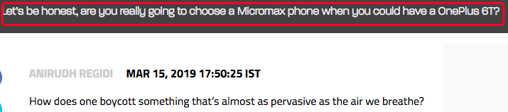 更有意思的是,在网页版上,标题下方还有一句导语写着:诚实点好么,当你眼前有部一加6T的时候,你还真会去选Micromax(注:印度当地品牌)的手机?