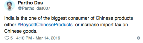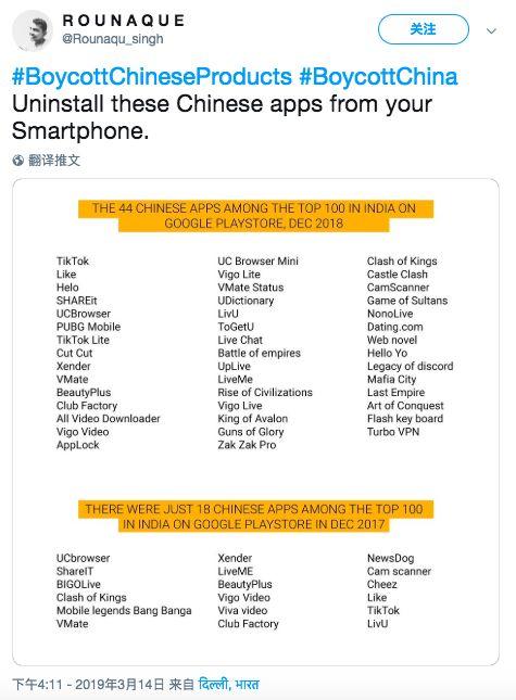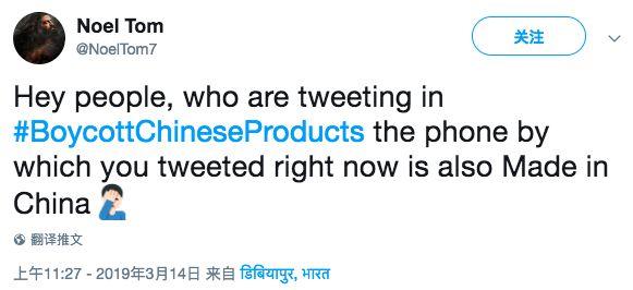 据多家印媒报道,在中国又一次未支持其制裁所谓“巴恐怖分子”的要求后,印度掀起了一股抵制中国产品潮,网友们在推特上纷纷使用话题标签#BoycottChineseProducts,呼吁大家一起行动。