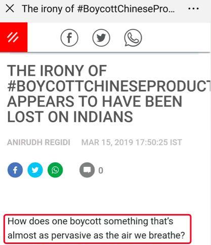 这是印度最大媒体集团Network18旗下的新闻网站firstpost在一篇关于最近印度网友抵制中国产品的文章的开篇语。