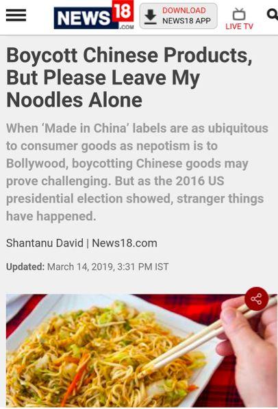 News18上还有一篇美食类文章为了蹭上热点也是煞费苦心。标题写着:抵制中国产品,但是求放过面条啊!