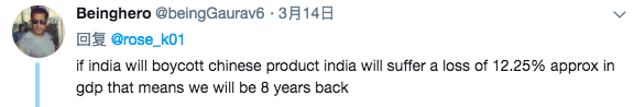 如果印度抵制中国产品,印度GDP大约会损失12.25%,这就意味着我们会倒退到8年前的水平。