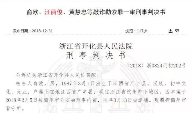 去年4月底,俞某等4人被开化法院以敲诈勒索罪判刑,其中俞某被判处有期徒刑11年6个月。去年12月4日,甘某、熊某、顾某三人被衢州市柯城区法院分别以受贿罪,判处有期徒刑三年二个月、五年、四年。