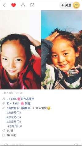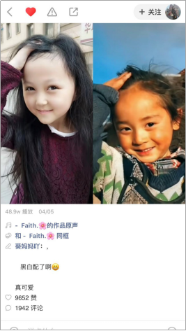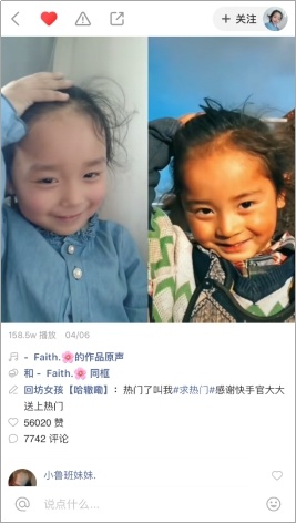 目前原发视频播放量已突破千万大关,老铁们尤其是各少数民族老铁们争相与其视频或音乐同框。截至4月8日,同框作品累计超过60万条。佤族、藏族、彝族、傈僳族、拉祜族等各民族的大小朋友都加入其中,和最美藏族小天使同框俨然变成各民族pk自然美的大趴。