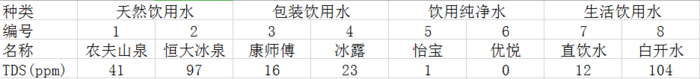 根据上表的数据可以看出,不同种类的水TDS值有着明显的差异,白开水TDS值最高,说明小编所在的广州地区自来水中溶解固体含量还是比较高的,也就是我们常说的“硬水”。而经过净水器过滤后的直饮水,TDS值显著下降,初步表明净水器对某些杂质的过滤是有效果的。饮用纯净水TDS值几乎为0,确实没有虚假宣传,水的纯净程度还是相当高的。天然饮用水TDS值比饮用纯净水和包装饮用水高不少,暂且可以说明天然水宣传的矿物质含量较其他瓶装水更丰富的情况属实。