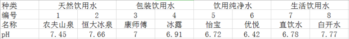 从表中我们可以看到,天然饮用水pH大于7,呈现弱碱性,这与包装上的宣传一致。白开水也呈现弱碱性,而其他水为弱酸性,接近中性。我国国家标准《生活饮用水卫生标准》GB5749-2006中,城镇饮用水pH应在6.5~8.5之间,当然pH的测量跟温度等外界因素有很大关系,所以可能实际测试值会有一定的误差,只要偏差不大就说明酸碱度在合理的范围。