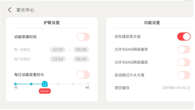 家长可在“家长”设置孩子的“每日观看时长”与“禁播时段”,超过设置时间后屏幕将会自动锁定。通过“禁播时段”设置孩子观看“禁区”,比如晚上6点-7点是孩子吃饭时间,不能看电视,家长就可把这个时间段设置禁播,以此来养成孩子的好习惯。如果家长希望继续复习动画内容,又担心伤害孩子视力,则可开启“音频收听”模式。