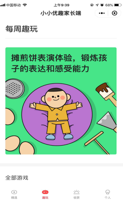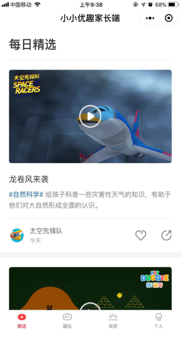 为了帮助忙碌的上班族父母提高亲子陪伴质量,小小优趣家长端小程序,特意为家长们准备了“每周趣玩”、“每日精选”、“今日收获”三个板块,便于亲子互动。