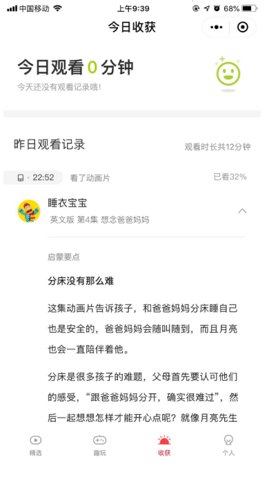“每日精选”板块将app内的动画剪辑成短视频,让家长在3分钟内掌握各类启蒙动画的重心,了解启蒙重点;“今日收获”板块家长可以看到孩子当日观看的启蒙内容要点,即便家长没空与孩子一起观看,也能知道孩子看了什么,便于亲子交流和互动。