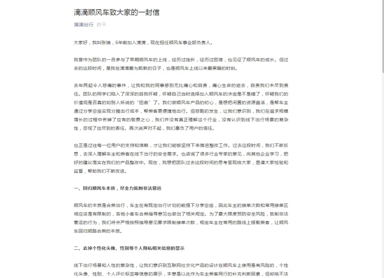 我曾作为团队的一员参与了早期顺风车的上线,经历过挫折,经历过困难,也见证了顺风车的成长。但过去的这段时间,是我在滴滴最为煎熬的日子,也是顺风车上线以来最黑暗的时刻。