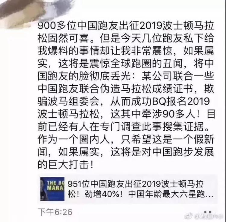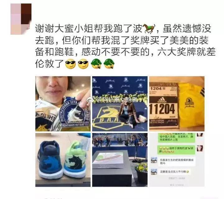 微博网名“阿拉蕾女跑者”爆出一张微博截图,指责一位跑者公然将自己的波士顿马拉松号码布转给好友,由好友代替其跑完比赛领奖牌。