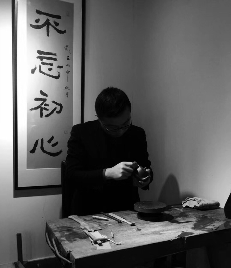 由于对文化的痴迷和热爱,戴非凡的天赋逐渐在紫砂领域凸显出来。在一次偶然的机会,结识了原紫砂一厂老艺人卢陶庐先生,由于两个人都是性情中人,便很快成了师徒关系,亦师亦友携手前行。在此期间,戴非凡跟着卢先生学习了紫砂仿铁系列、仿木系列、仿竹系列紫砂的表现手法,很快得起真传。得道的戴非凡也逐渐从原本的紫砂商人变成了紫砂手艺人。“要想走得更远,飞得更高,我们必须懂得紫砂的泥性和亲历紫砂从无到有的故事。”