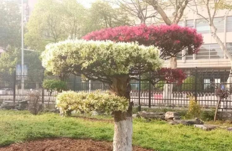 武汉市园林科学研究院植物专家董立坤,在观看这些景观树的照片后说,这些景观树全是由白花檵(j�)木与红花檵木两种树嫁接而来的。
