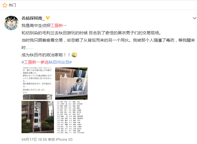 【环球网报道 实习记者 崔妍】“工藤新一不当侦探,改去参选市议员了!”18日,一则这样的消息登上微博热搜。