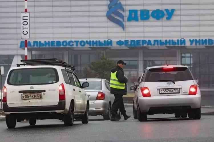 4月23日,在俄罗斯符拉迪沃斯托克的远东联邦大学,安保人员对准备进入校园的车辆进行安全检查。新华社记者白雪骐摄