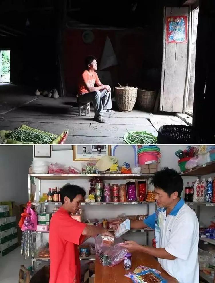 新华社照片,拼版照片:上图为广西都安瑶族自治县三只羊乡建良村龙牙屯,廖振毅坐在搬迁前的老房子里(2017年10月11日摄);下图为广西都安瑶族自治县三只羊乡可力易地扶贫搬迁安置新区,廖振毅(右)在自己开的商店里给顾客打包商品(2017年10月12日摄)。新华社记者 陆波岸 摄