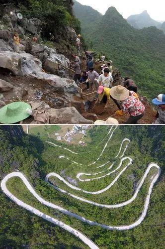 新华社照片,拼版照片:上图为都安瑶族自治县保安乡上镇村村民在悬崖峭壁间修路(新华社记者刘广铭2012年6月1日摄);下图为都安瑶族自治县龙湾乡境内的盘山公路(新华社记者陆波岸2017年7月27日摄)。