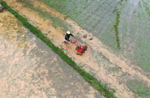 新华社照片,在广西都安瑶族自治县澄江镇境内,村民在田间春耕(2019年3月9日无人机拍摄)。新华社记者 陆波岸 摄