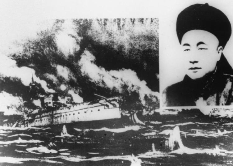 资料图片:1894年爆发的中日甲午战争由于清政府腐败,以中方失败而告终。但广大爱国军民仍进行了英勇的战斗。在黄海海战中,北洋水师“致远”舰管带邓世昌(右上)在弹尽舰伤的情况下,毅然开足马力向日舰“吉野”号猛撞过去,不幸被鱼雷击中,全舰官兵壮烈殉国。图为战斗中的“致远”舰。新华社稿