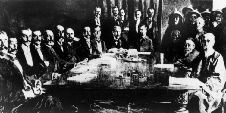 资料图片:1901年9月7日,清政府与西方列强签订《辛丑条约》。这是中国近代史上赔款数目最庞大、主权丧失最严重的条约。此条约标志着清政府完全成为帝国主义统治中国的工具,中国彻底沦为半殖民地半封建社会。图为李鸿章代表清政府与11国的驻华公使,在北京签订《辛丑条约》。新华社稿