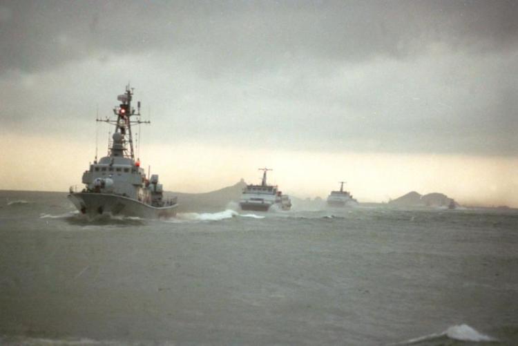 1997年7月1日早晨,中国人民解放军驻香港部队海军舰艇大队十艘船只驶入香港海域。8时25分全部舰只在香港昂船洲码头靠岸。新华社记者 赵建伟 摄
