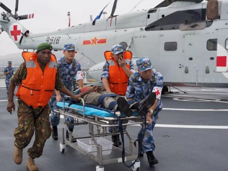 2018年7月17日上午,正在执行“和谐使命-2018”任务的中国海军和平方舟医院船官兵与巴布亚新几内亚医务工作者在莫尔斯比港成功举行了一场联合应急医学救援演练。新华社发(江山摄)