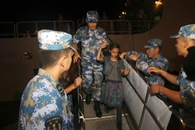 2015年3月29日,中国海军第十九批护航编队临沂舰抵达也门亚丁港,临沂舰女舰员帮助撤离的儿童登舰。新华社发(熊利兵摄)