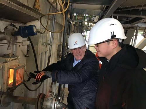 图为3月19日德国EEW公司负责人(左一)正在介绍垃圾焚烧车间的情况,左侧为焚烧炉的观察口。(新华社记者任珂摄)