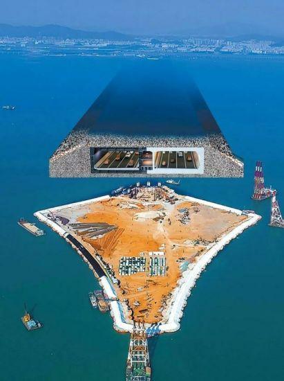 ▲深中通道人工岛和沉管隧道示意图