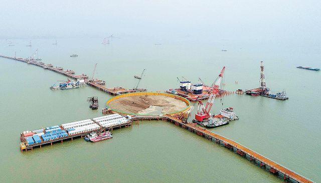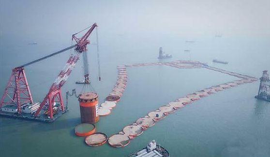 ▲深中通道钢圆筒振沉施工现场