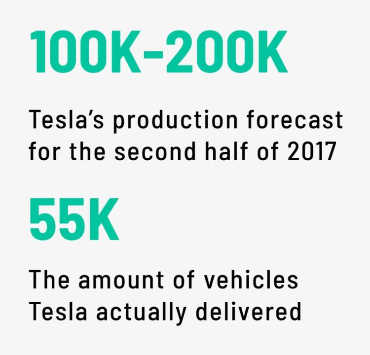 马斯克对特斯拉的生产能力做出了大胆的预测,预计特斯拉2017年下半年的产量将在10万至20万辆之间,2018年将完成50万辆整车,约为2016年产量的6倍。事实证明,这一预测大错特错:特斯拉在2017年下半年只交付了约5.5万辆汽车。