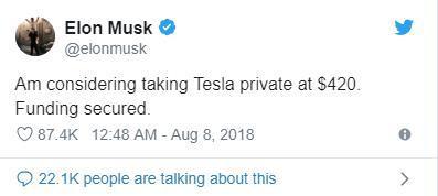 “我正在考虑以420美元的价格将特斯拉私有化。以资金担保。”特斯拉首席执行官埃隆⋅马斯克在推特上表示要将公司私有化。此举导致特斯拉股票在停牌前飙升逾10%。马斯克后来放弃了私有化计划。