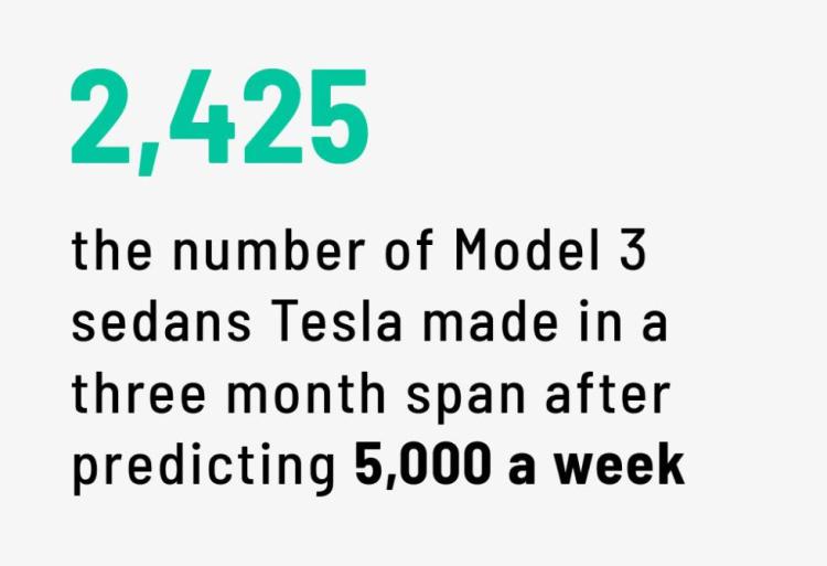 Model 3轿车的生产问题很多。该公司说,未能达到生产目标,过去三个月只生产了2,425辆Model 3轿车。他们本预测每周生产5000辆。