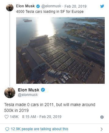 马斯克2月19日在推特上表示,“特斯拉2011年生产了0辆汽车,但2019年将生产50万辆左右。”