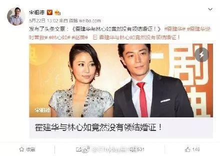 据悉,2017年5月22日,认证为“自媒体”的微博用户@宋祖德 发布名为《霍建华与林心如竟然没有领结婚证》的文章。