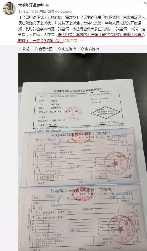 3月25日,某律所发布案件播报,宣布霍建华、林心如联合起诉宋祖德名誉权纠纷案二审胜诉。当事人终于发布了这条迟到的微博......
