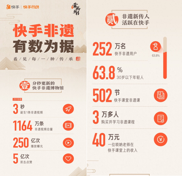 类似这样的故事还有很多。快手第一次发布的非遗长图数据报告显示,在快手,每3秒钟就诞生1条非遗视频。在过去的2018年里,有252万名用户在用快手记录非遗内容,其中年龄在30岁以下的用户占到了63.8%;他们共发布了1164万条非遗视频内容,累计共获得250亿播放量,相当于全国平均每人观看18次,收获5亿次点赞。