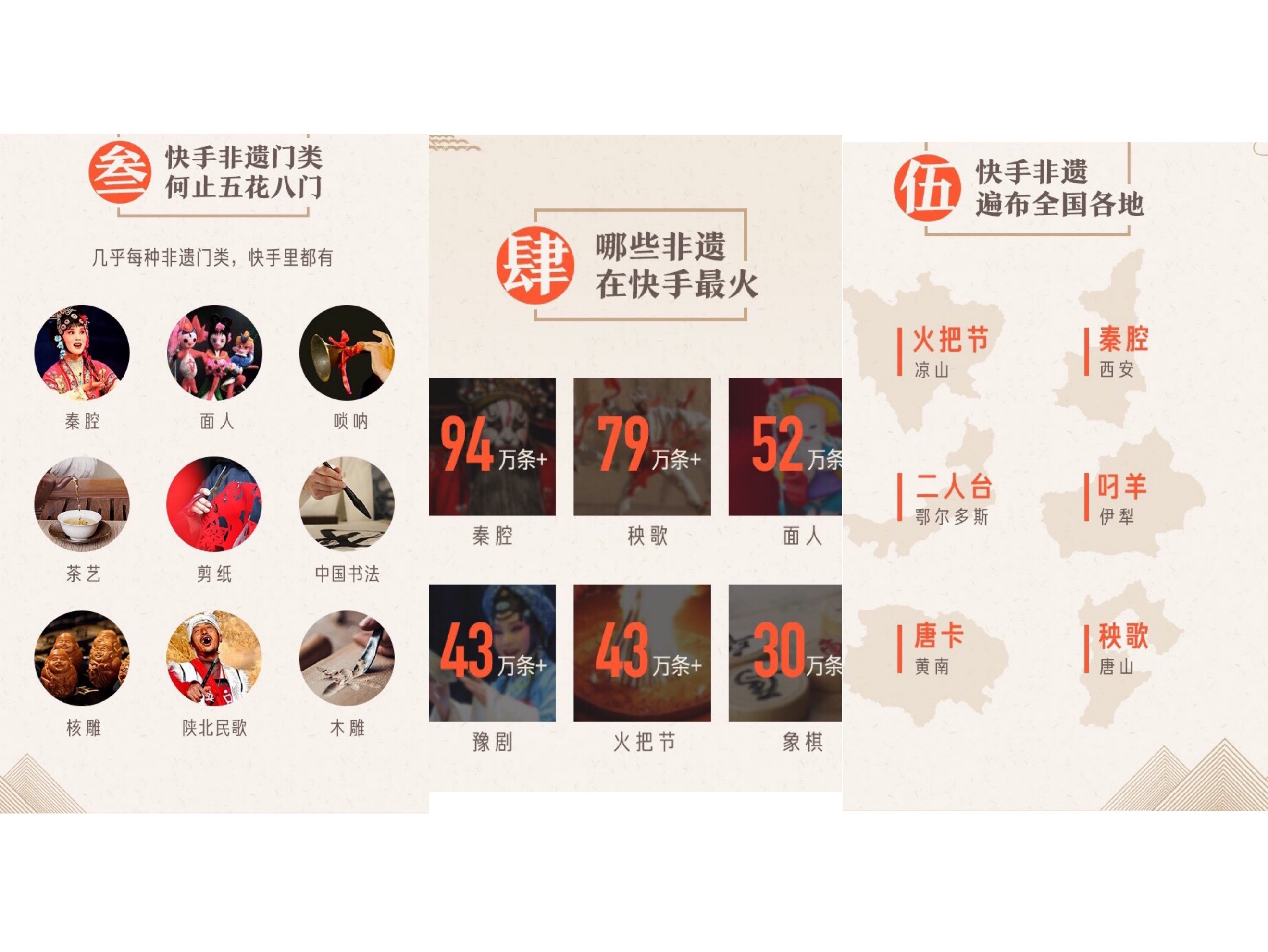 不仅如此,快手上的非遗涵盖了多种门类,在1372项国家级非遗项目中,快手上涉及的非遗项目达989项,占比高达72%。其中最受欢迎的十大非遗内容分别是秦腔、秧歌、面人儿、豫剧、火把节、庙会、象棋、晋剧、二人台。