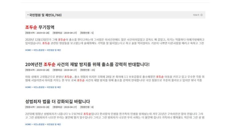 截至2017年底,超60万名韩国民众在青瓦台官网发起请愿,请求改判赵斗顺无期徒刑。