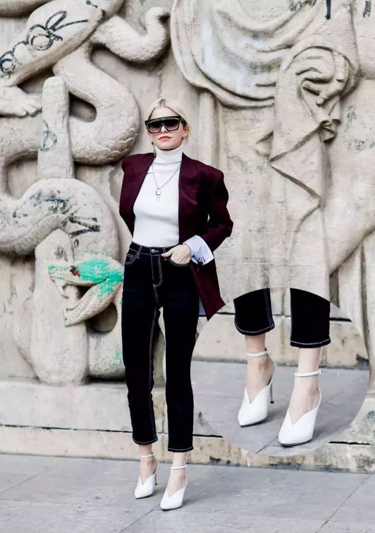 宇博Clarai丝绒西装款外套,内搭白色锁头针织毛衣,黑色烟管九分牛仔裤与纯白女巫鞋呼应,对比冲突色一片和谐,气场立显。