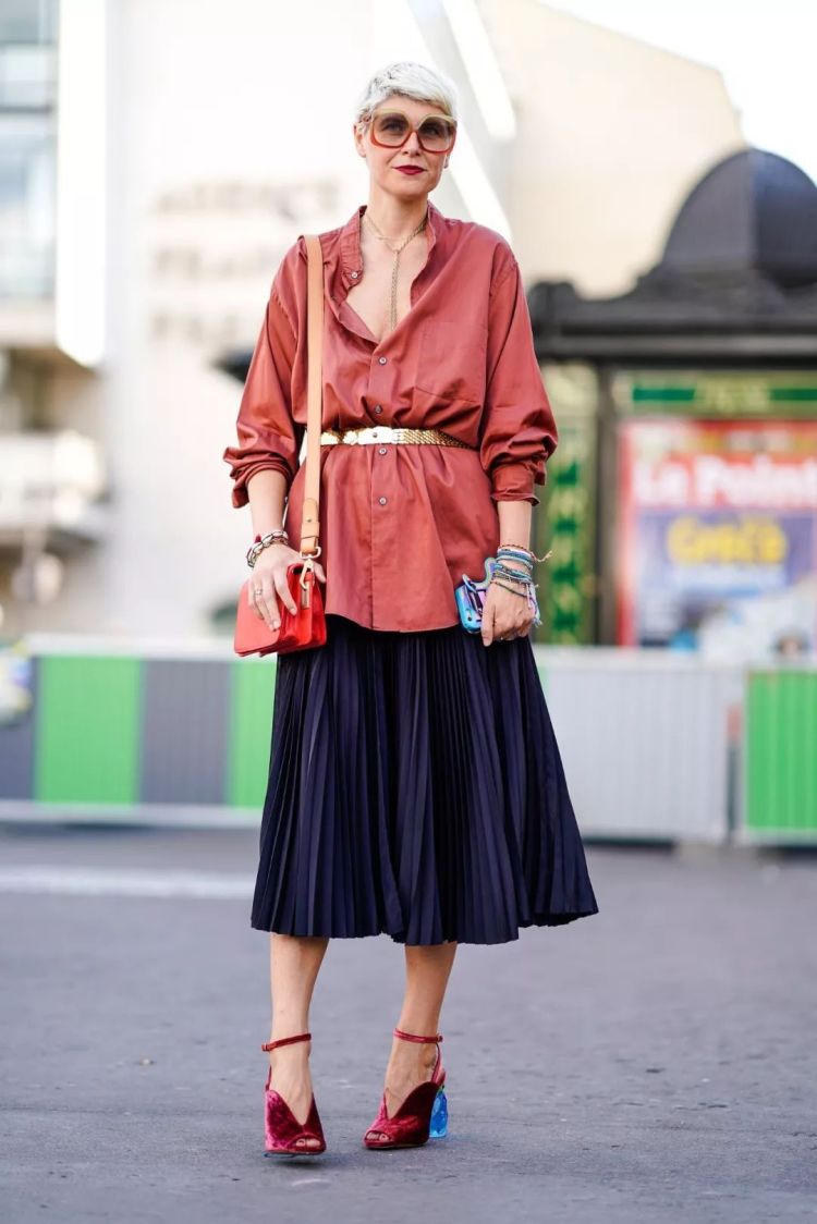 自古红蓝出CP,红色针织套裙,内搭蓝色衬衣,露出领子和袖口,在搭配自家棕色深V鞋,妥妥一个经典又时髦的三原撞色。