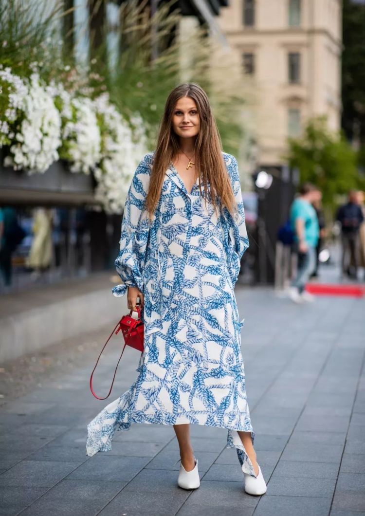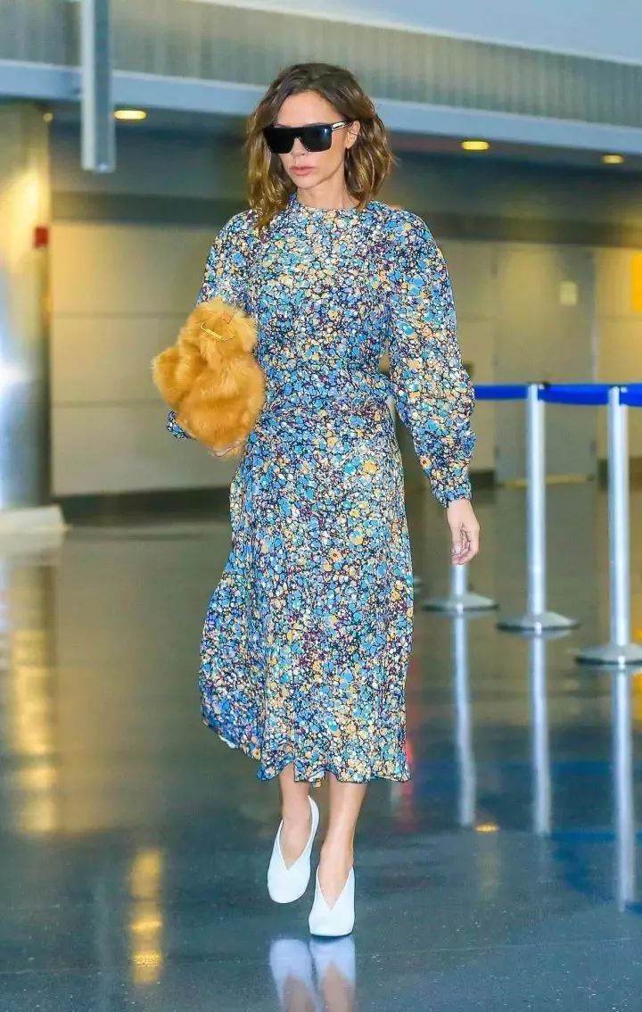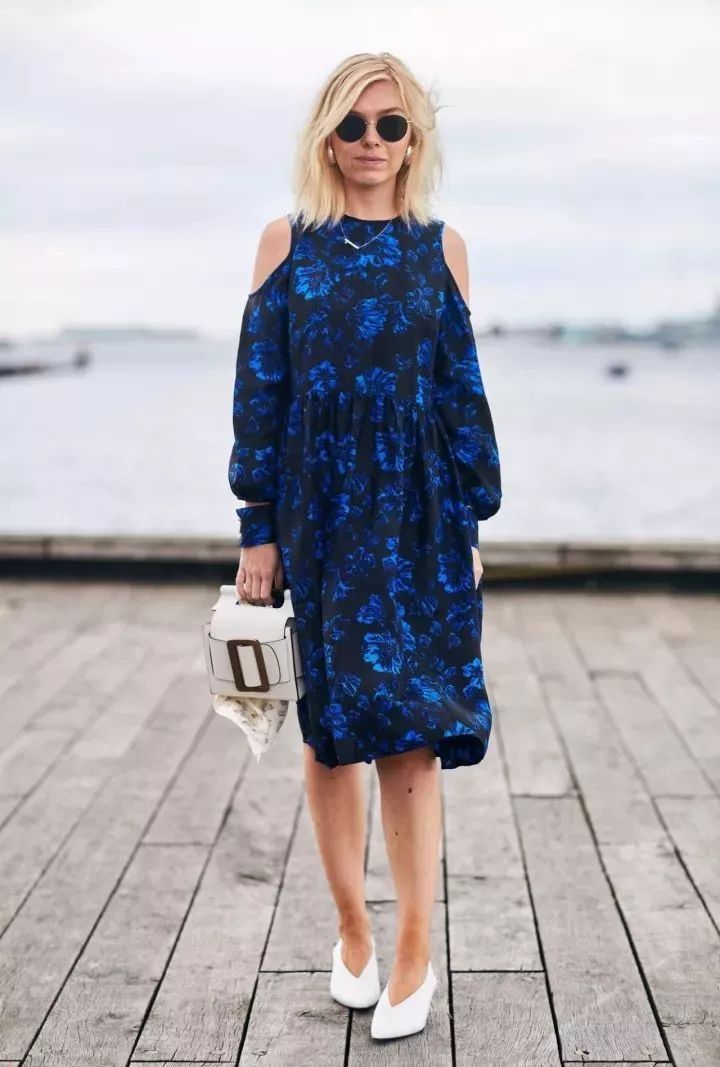 实在的用Head to Toe的连衣裙搭配深V鞋,整体感强显高,蓝色碎花长裙非常有存在感,搭配橘黄毛毛手包有强烈的色彩和材质对比。