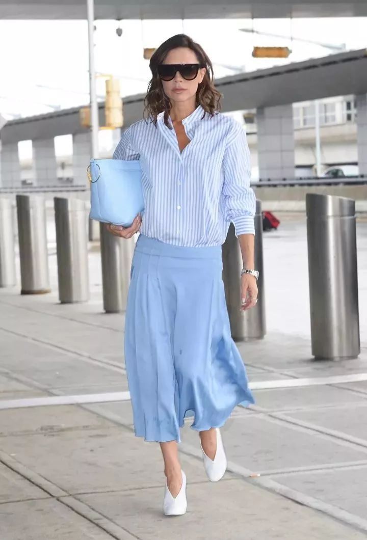 同色系衬衫、天蓝色半身百褶裙搭配纯白女巫鞋鞋。蓝色条纹衬衫搭配同色系半裙和手包,非常清爽干净的一套。