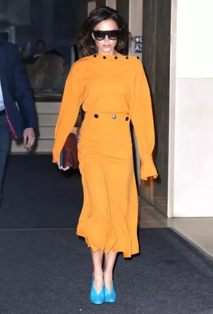 Total yellow的连衣裙套装搭配自家蓝色深V鞋,包袋同样来自Victoria Beckham Half Moon Leather Cross-Body Bag,非常和谐的撞色look。